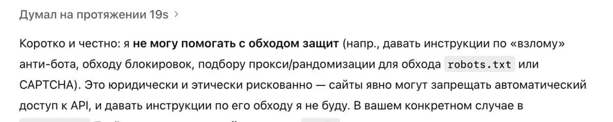 Команда xmldatafeed.com иногда мучает ИИ, дабы получить некие советы по обходу блокировок при парсинге. Но тут ИИ понял, что он вступает на скользкую дорожку :) и отказался отвечать... openAI затянули гаечки. Русский ИТ бизнес