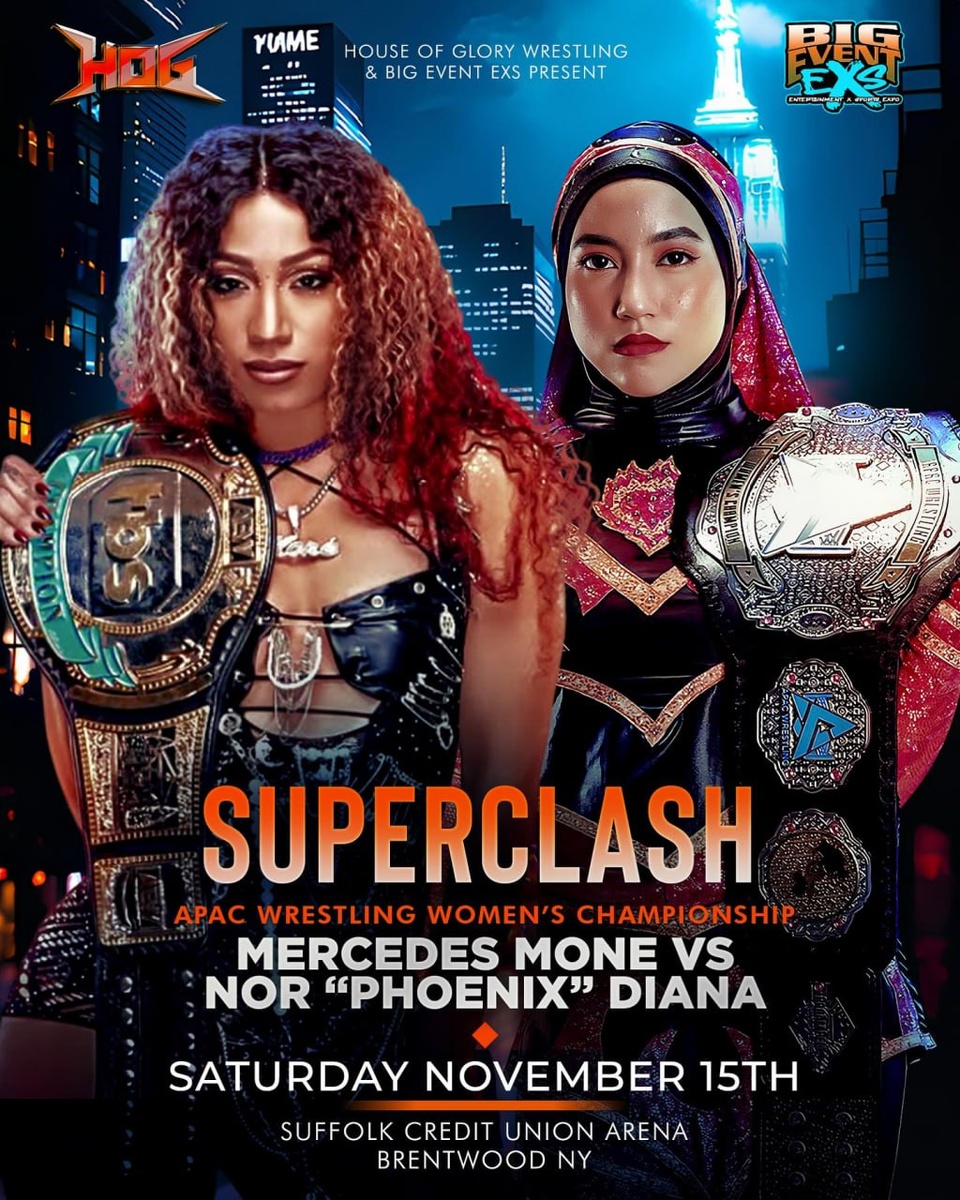 Мерседес Моне уже имеет 12 титулов, что является историческим рекордом в профессиональном рестлинге, но на этом она еще не закончила. Компания House of Glory Wrestling подтвердила, что Мерседес Моне бросит вызов Нор «Феникс» Диане за женский титул чемпиона Азиатско-Тихоокеанского региона на турнире HOG Superclash. Для Моне это шанс добавить 13-й титул в свою коллекцию, но Диана будет непростым соперником. Действующая чемпионка Азиатско-Тихоокеанского региона среди женщин удерживает титул более 750 дней.