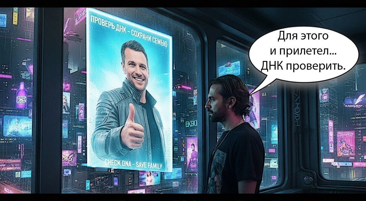 45 минут пролетели как миг. Приземление в Екатеринбурге: аэропорт «Кольцово-Гипер», с аэротакси на крыше и целой вереницей беспилотных такси на специальной полосе перед входом. Ночь, но город сиял неоном: башни с электромонохромными окнами, дроны-курьеры, и… как минимум два огромных голографических билборда «Проверь ДНК – сохрани семью!».