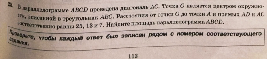 В параллелограмме ABCD проведена диагональ АС. Точка О является центром окружности, вписанной в ∆АВС. Расстояние от точки О до точки А и прямых АD и АС соответственно равны 25, 13, 7. Найдите площадь параллелограмма.