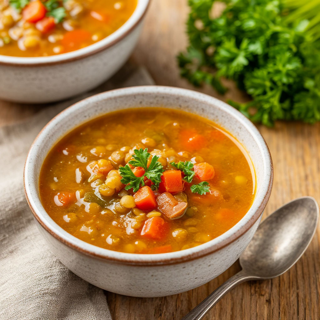 Вот подробный рецепт классического чечевичного супа с несколькими вариациями. Классический чечевичный суп (с мясом) Ингредиенты (на кастрюлю 4-5 литров): · Чечевица: 300-400 г (лучше брать коричневую или зеленую, она хорошо держит форму) · Мясо: 400-500 г (говядина на кости, бараньи ребрышки или куриные окорочка для наваристого бульона) · Лук: 1 крупная головка · Морковь: 1-2 шт. · Картофель: 3-4 шт. (средние) · Томатная паста: 2 ст. ложки (или 2 свежих помидора, очищенных от кожицы) · Растительное масло: для жарки · Специи: лавровый лист (2-3 шт.), черный перец горошком, молотый черный перец, паприка, сушеные травы (чабер, орегано) — по вкусу. · Соль: по вкусу · Зелень: пучок свежей петрушки или кинзы · Вода: около 3 литров Пошаговое приготовление: 1. Готовим бульон: Мясо промойте, положите в кастрюлю, залейте холодной водой. Доведите до кипения, снимите пену. Убавьте огонь, добавьте лавровый лист и перец горошком. Варите бульон от 1 до 2 часов (в зависимости от мяса), пока м