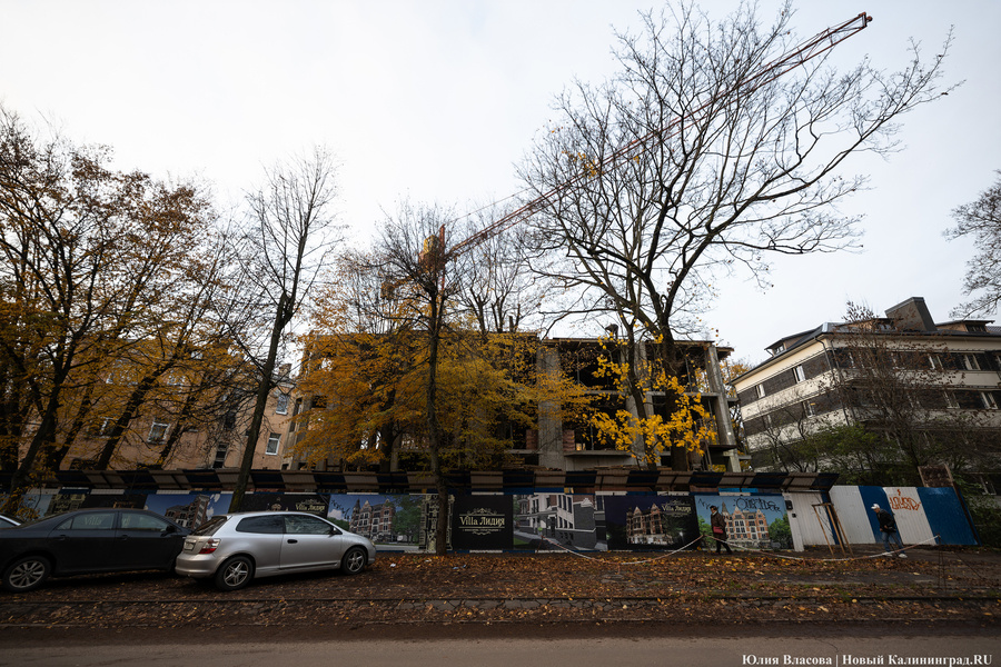 здесь возводится пятиэтажный многоквартирный дом «со встроенным подземным паркингом и помещениями общественного назначения» застройщиком официально значится Наталья Мазилкина — родная сестра председателя Законодательного собрания Калининградской области Андрея Кропоткина. Закончить строительство дома № 8 планируется в декабре 2026 года. Также паспорт сообщает, что строительство осуществляется силами компании «Кёниг-Хольц». На размещённом на заборе плакате — изображение будущего здания «в стиле виллы Шмидта», фотографии которого ещё в октябре 2024 года были предоставлены источником «Нового Калининграда».