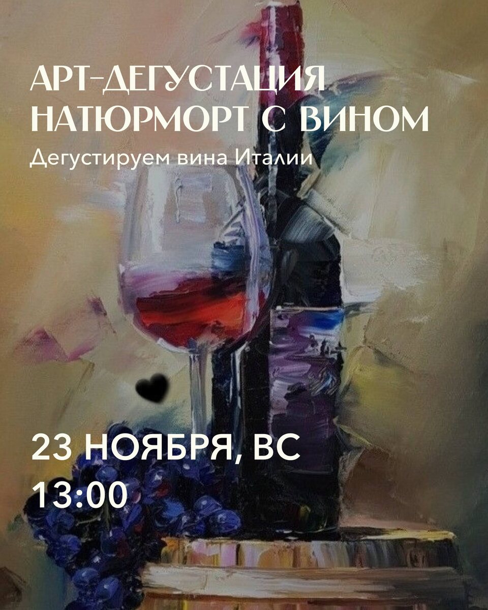 РАСПИСАНИЕ АРТ-ДЕГУСТАЦИЙ НОЯБРЬ-ЯНВАРЬ 23 НОЯБРЯ 13:00, НАТЮРМОРТ С ВИНОМ Под руководством художника нарисуем натюрморт с вином! Дегустируем вина Италии. Сопровождение - эногастрономическая тарелка. 7 ДЕКАБРЯ 13:00, ШАМПАНЬ Под руководством художника нарисуем бутылку шампанского! Дегустируем игристые вина. Сопровождение - эногастрономическая тарелка. 21 ДЕКАБРЯ 13:00, КОШКА В ТРОПИКАХ Под руководством художника нарисуем тигра! Дегустируем фруктовые бомбы Нового Света. Сопровождение - эногастрономическая тарелка. 28 ДЕКАБРЯ 12:00, ЕЛКА Под руководством художника нарисуем елочные игрушки на елке! Дегустируем новогодние винные стили. Сопровождение - эногастрономическая тарелка. 4 ЯНВАРЯ 13:00, ПАРИЖ Под руководством художника нарисуем Эйфелеву башню! Дегустируем вина Франции. Сопровождение - эногастрономическая тарелка. Вы нарисуете завораживающую картину! А художник поможет Вам нарисовать ее с нуля🩷 💵Стоимость участия - 4600₽ с человека . Все художественные материалы в