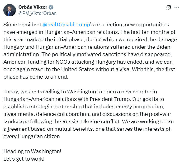 В ответ на пост Hungarian PM Orban heads to DC to meet Trump Aiming to boost strategic cooperation in energy, investment, and defense while discussing Europe's future post-Ukraine conflict