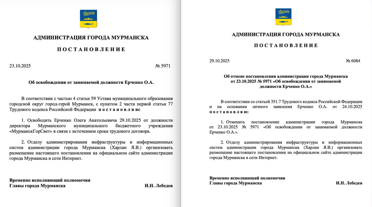 В ответ на пост Уйти нельзя остаться? Впрочем, в случае с руководителем «Мурманскгорсвета» Олегом Ерченко фраза вполне может звучать – «уйти, чтобы остаться». Ранее «Арктический Обозреватель» сообщил, что после вручения уведомления о прекращении трудового контракта, директор ММБУ на скорую руку заключил годовой контракт с Минобороны (имеется в распоряжении «АО») и поставил об этом в известность непосредственного работодателя – Комитет по развитию городского хозяйства. С точки зрения нормы закона и здравого смысла, военный контракт, заключенный после получения уведомления о непродлении контракта трудового – это личное дело гражданина, и никак не влияет на дальнейшие взаимоотношения между работником и работодателем. Но, видимо, словосочетание «контракт с министерством обороны» возымело некое священное действие на администрацию и КРГХ, и они решили «дать заднюю», отменив ранее изданное постановление о расторжении контракта. То есть, сознательно пошли на некоторое нарушение логики Кодекс
