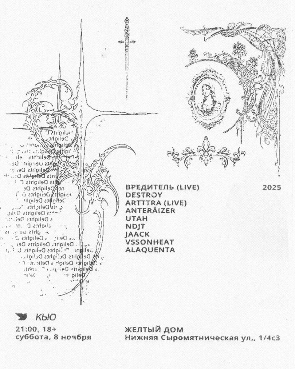 ЖЕЛТЫЙ ДОМ, НИИ СНЕГИРИ х КЬЮ / 8 ноября В эту субботу мы собираемся в стенах Желтого Дома. Вас ждет музыкальная программа, собранная НИИ СНЕГИРИ и КЬЮ — почти все виды электронного музыкального искусства: от a/v лайвов до виниловых сетов и новые имена в программе! 👉1 сцена: Вредитель (live,нии снегири) ARTTTRA (live,нии снегири) JAACK Sycoraxy 🆕 MOYSH4 NDJT 👉2 сцена: Beyond Reason b2b Earrapia 🆕 Anteräizer (нии снегири) DESTROY VSSONHEAT (нии снегири) UTAH ALAQUENTA 🎫 Билеты 1000₽ FC/DC 18+ 📆 8 ноября, в 21:00 📍Желтый Дом, Нижняя Сыромятническая 1/4 стр.3, Москва