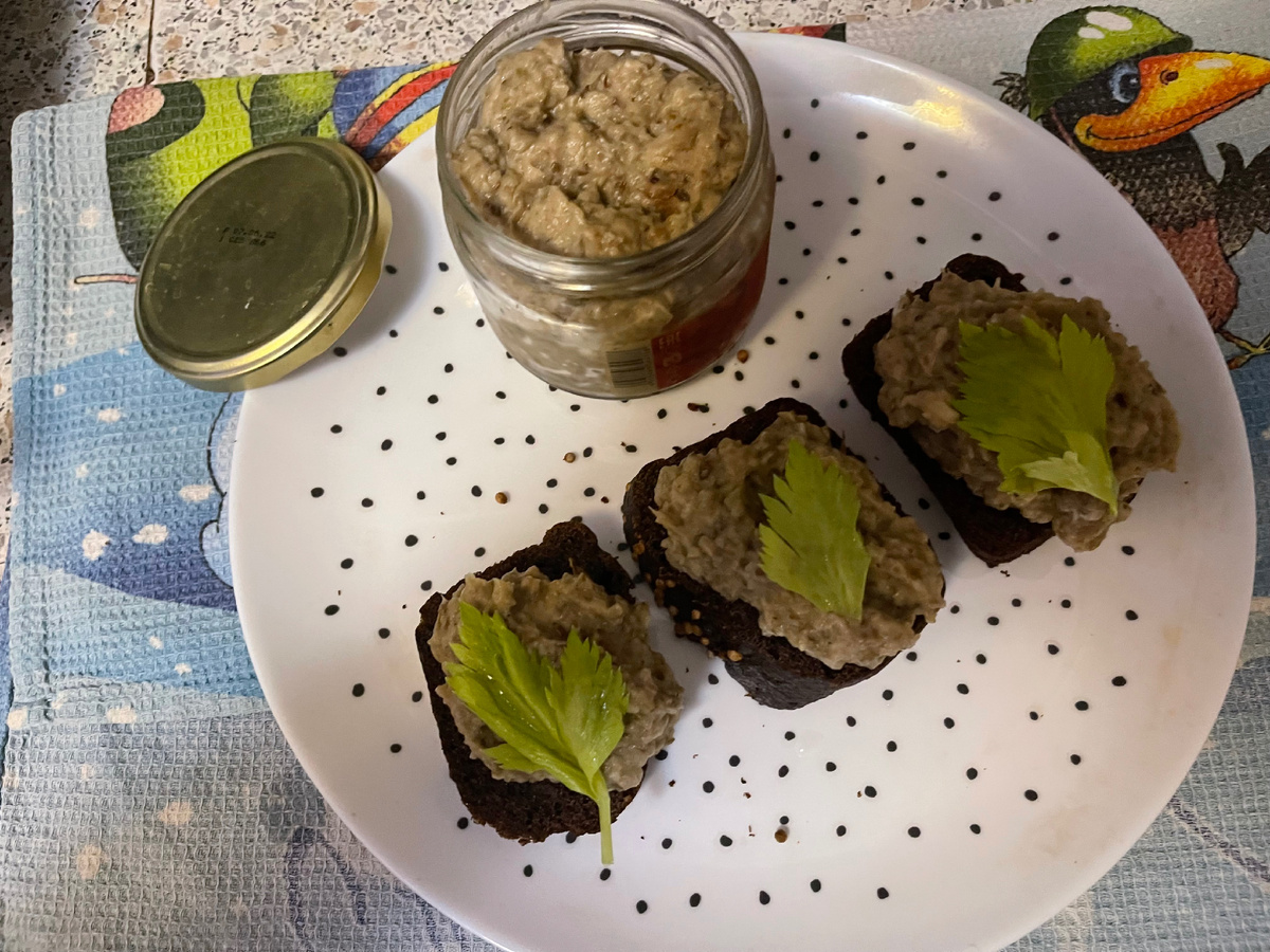 Ингредиенты ; 4 - 6 крупных баклажанов , 2 зубчика чеснока, 1 ч.л. Семян зиры, 2 ст.ложки майонеза , 2ст.ложки оливкового масла , соль, черный молотый перец по вкусу , черный хлеб для подачи Приготовление: паштет лучше приготовить заранее, ему нужно настояться. Разогреть духовку до 200 градусов . Часто наколоть баклажаны по всей поверхности, положить на застеленный фольгой противень и запекать до мягкости, примерно 30 минут . Горячие баклажаны разрезать пополам, немного остудить и вынуть ложкой мякоть. Сложить мякоть в дуршлаг или сито и поставить стекать на 30 минут. Тем временем раздавить, очистить и измельчить чеснок. Нагреть оливковое масло в небольшой сковороде, положить зира и чеснок, обжарить на слабом огне минуты 2. Смешать масло с чесноком и зирой с обсушенными баклажанами. Добавить Майонез, соль, перец и взбить погружным блендером в пюре. Затянуть пленкой и дать настояться в холодильнике 6 - 12 часов. подавать паштет с хлебом или с тостами. приятног