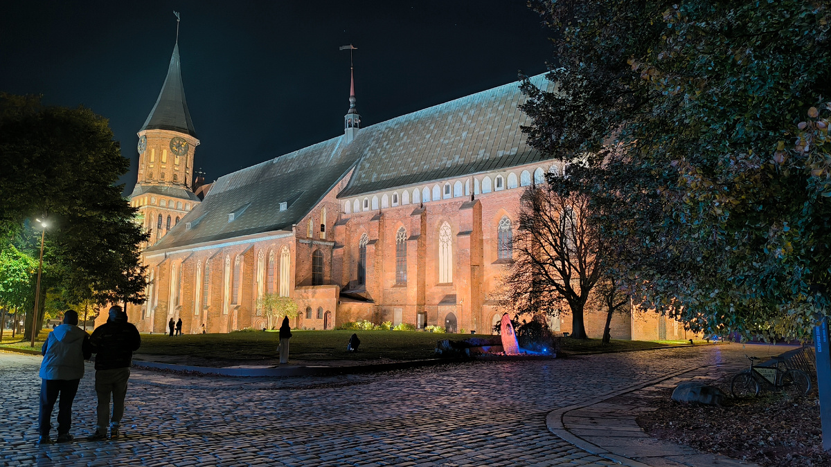 В прошлый раз я закончила рестораном. Но на самом деле экскурсия закончилась около башни Врангеля, где я и распрощалась с гидом. А потом я чуть-чуть заглянула на рынок, точнее прошлась по торговой улице вдоль его стены. Зашла за марципаном (странная вещь, как мёд у Винни Пуха, только он есть, и сразу нет), подумала купить кофе с кренделем, но поняла что слишком голодная и вернулась на берег пруда в упомянутый ресторан. А потом пошла домой, потому что глаза голодные, порции большие и хорошо что можно забрать с собой. До квартиры я добралась к 6 и разумеется после небольшого отдыха, согревшись и переодевшись потеплее, я снова пошла гулять. Один из Калининградских гидов высказал мысль про ночной остров Канта, глинтвейн и марципан. Я не могла не проверить. Марципан у меня был только что куплен на рынке, а глинтвейн и крендель я купила на площади перед собором. И пошла гулять по острову, пока стаканчик горячий. Пётр Первый величаво игнорирует весь этот бардак. Собор с подсветкой похож на ск