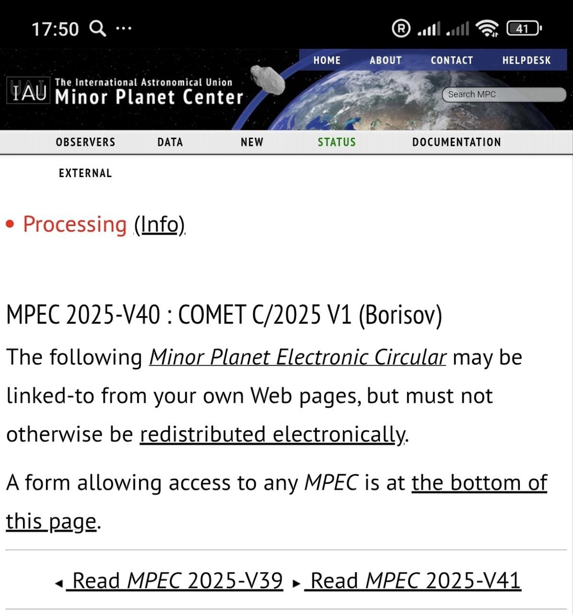 Новая комета Геннадия Борисова получила постоянное имя: C/2025 V1 (Borisov). Эксцентриситет кометы все же больше 1 (e = 1,0096). А это значит, что после прохождения 16 ноября точки перигелия (ближайшего расстояние к Солнцу, 0,к6 а. е) комета навсегда покинет Солнечную Систему. И превратится в межзвездного странника. Так что наш земляк, Генадий Борисов, можно сказать, еще одну межзвездную открыл, но - будущую! Конечно, при приближении к Солнцу все может произойти... Но - посмотрим, ждать осталось недолго... #астрономия #кометы