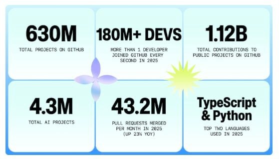 Каждую секунду к гиту подключается 1 новый разработчик. И ребята из Индии вырвались в лидеры по числу контрибьюторов в проектах. Их просто много :) Более 4 млн репозиториев так или иначе связаны с генеративным ИИ. Чуете куда дует ветер? :) И еще. Python, как язык программирования, сполз на второе место, уступив TypeScript. Ну а остальное на картинке, сорри качество чуть плохое... Русский ИТ бизнес