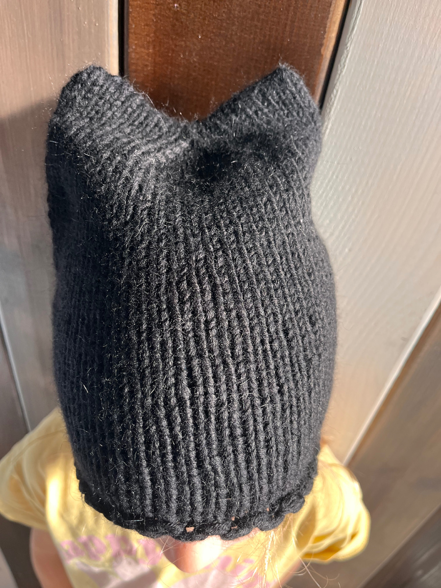 - Далее: Вяжите все петли лицевыми по кругу (Лицевая гладь) до тех пор, пока высота шапки не достигнет желаемой минус 3-4 см (это примерная высота макушки с ушками).