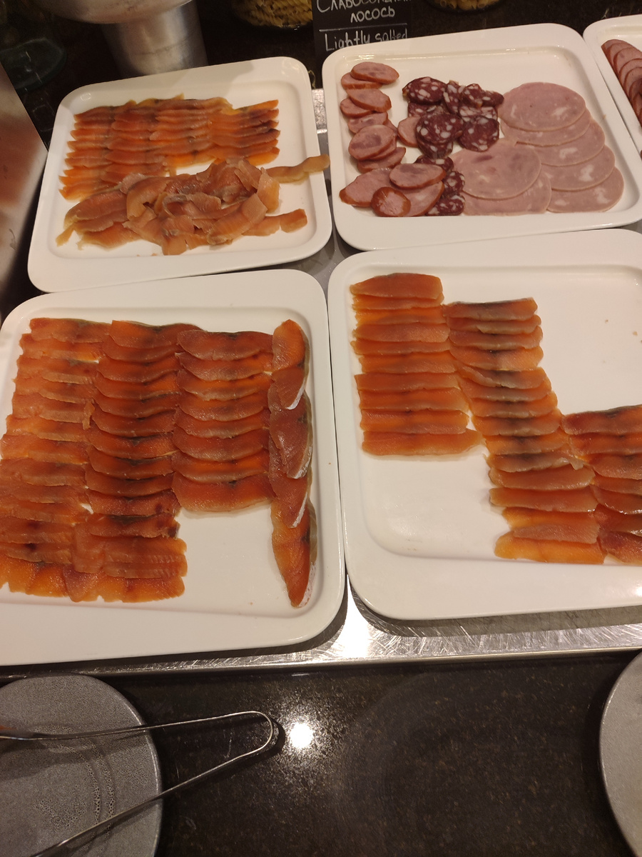 Помните, была такая повесть у Сергея Михалкова "Праздник непослушания"? Как поступают люди, приехавшие в другой город на выходные? Они как оголтелые носятся по достопримечательностям, музеям, выставкам, паркам и прочее. А как быть, если не хочется? А если хочется валяться, читать и спать? А если на улице всё время моросит дождь? Если кровать прекрасна, номер радует, ресторан в гостинице кормит? Электронные книги закачаны хорошей литературой? И мы приняли гениальное решение. Делать что хочешь. Завтрак порадовал. Завтракали мы часа два. Завтрак был роскошен. Три сорта удивительно вкусной малосольной красной рыбы. А мы-то в этом знаем толк, посколькужена с Камчатки)) Всякие другие нарезки, Народу толпится немеряно, поэтому фоткать не слишком удобно. Отдельно - салатная зона, где можно набрать себе хоть Цезарь, хоть греческий салатик, хоть что угодно: Главная прелесть - вполне приличное шампанское: Всё это вместе выглядит примерно вот так: Или вот так: В баночке - отличный паштет,