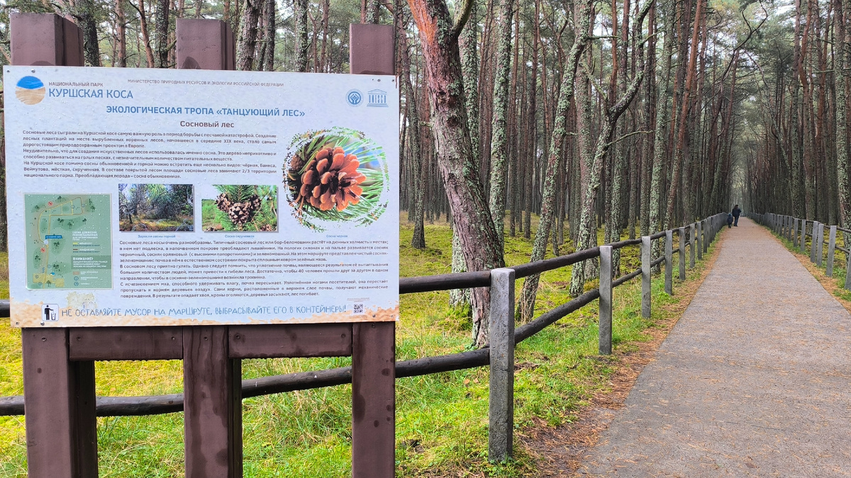 Танцующий лес это ещё один из знаковых и очень популярных маршрутов Куршской косы. Как и немалая часть остальных лесов на косе, этот лес рукотворный. Он был посажен в 1961 году на дюне Круглой для укрепления песков Куршской косы. В отличие от большинства дюн косы, тянущихся вдоль берега Куршского залива, отдельно находящаяся дюна Круглая располагается на плоской лесистой равнине, располагающейся между Балтийском морем и заливом. Как и все леса здесь он уязвим и прогуляться по нему можно только по специальным дорожкам. В результате получаются очень небольшая и, если честно, не очень интересная территория. Именно танцующих, изогнутых деревьев не так много. Но сам лес, его атмосфера очень приятный, я прогулялась с удовольствием даже и просто так. Как раз заняла время до следующего автобуса и переехала к орнитологической станции. Попала между экскурсиями и пошла на берег моря провести полчаса. На пляже ветра нет, в лесу ветра нет и тепло. А на дюне прямо сдувает. Здесь практически безлюд