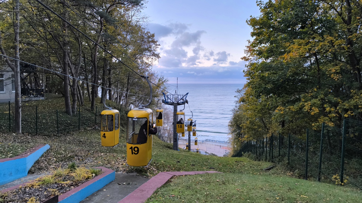 К вечеру я поняла, что всё-таки я немного пришла в себя. И как раз вовремя, у меня осталось достаточно времени, чтобы успеть спуститься на пляж на фуникулёре. Облака немного раздуло и стало красиво. Несмотря на ветер, на пляже много народу. Дети бегают за чайками, кто-то снимает закат, несколько человек купалось. Красиво, но ветрено, я достаточно быстро замёрзла и поднялась наверх, для разнообразия пешком по лестнице. Вышла куда-то в тёмные закоулки и не сразу выбралась на улицу. Но настроение я всё же поймала и решила пойти на уже готовую часть променада, в надежде поснимать там красивую подсветку и посидеть где-нибудь с глинтвейном глядя на волны. По пути прошла Янтарь холл, решила зайти на обратном пути или на следующий день. С наружи смотрится интересно, и есть надежда, что внутри тоже сделано оформление, а не коробка. Вниз спустилась на лифте. Можно было пройти чуть назад и спуститься около солнечных часов, но если честно, я просто забыла про этот спуск. В этот раз панорамным о