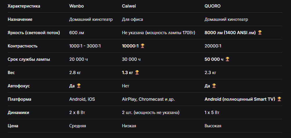 Всем привет! Сегодня разберем очень популярный вопрос: как выбрать хороший проектор для фильмов и не только? На примете три частых гостя в рекомендациях: Wanbo, Caiwei и QUORO. С виду все обещают Full HD и умные функции, но дьявол, как всегда, в деталях. Давайте отбросим маркетинг и посмотрим на реальные характеристики. Для наглядности — главные параметры в одной таблице: 1. Wanbo: Универсал для квартиры Этот портативный проектор — классика жанра. Ростест, привычные Android и iOS, хорошие динамики по 8 Вт. Он идеально подойдет для спальни или гостиной, где вы можете полностью затемнить комнату. Плюсы: Минусы: Ссылка на товар: https://market.yandex.ru/cc/7wuMCr