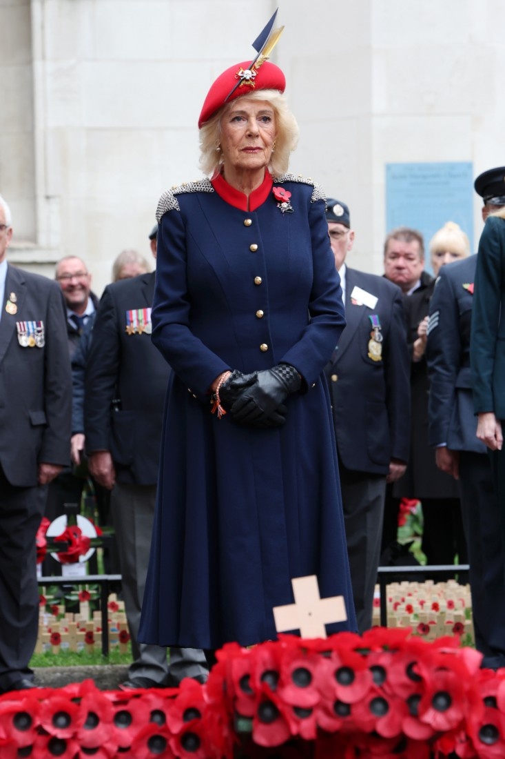 Сегодня Камилла посетила 97-ю ежегодную службу на Поле памяти в Вестминстерском аббатстве. Чарльз веселился отдельно, награждая дам в шляпках во дворце. Наряд Камиллы заставил кипеть мозги всем модным экспертам. Но, как проконсультировали нас уже эксперты из других областей, консорт решила совместить несколько регалий разных полков в своем наряде. Перья есть, череп всегда красиво смотрится, так чего бы и не совместить, как в том анекдоте. Итак, Камилла теперь не только лично себя прихорашивает, но и комбинирует регалии и немножко добавляет красоты в почти военное платье. Не сказать чтобы все подданные оценили.