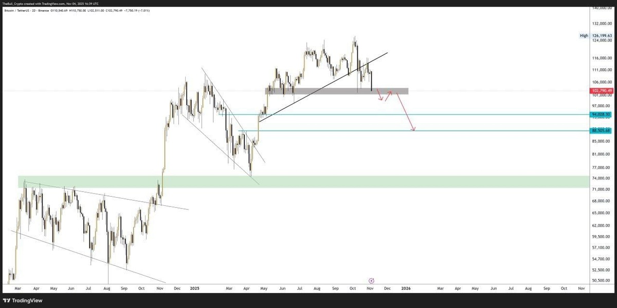 $BTC Среднесрочный взгляд с закрытой зарубежной группы: Прорыв трендовой линии: BTC только что пробил вниз свою краткосрочную восходящую трендовую линию, которая поддерживала цену с середины года. Это указывает на потерю бычьего импульса и возможность коррекции или консолидации. Разбор сценария: закрытие дневного/2D свечи ниже $102,000 подтвердит краткосрочный максимум, открывая цели снижения около $94,000 → $88,000, что соответствует предыдущим структурам минимумов и зонам с высоким объемом. Ключевые поддержки: $102,000 – $104,000 → краткосрочный ретест (в настоящее время тестируется) $88,000 – $94,000 → средний кластер поддержки $70,000 – $75,000 → основная структурная поддержка (зелёный блок), также совпадает с базой консолидации после ETF.