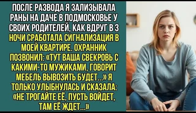— Это вы хозяйка квартиры по улице Лесной, дом 15? Тут ваша свекровь с какими-то мужиками говорит, мебель вывозить собирается. Мы охрану вызвали, но лучше приезжайте сами, разбирайтесь.
