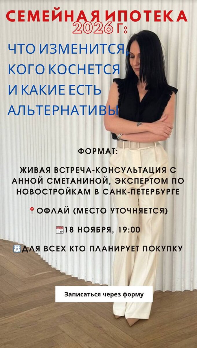 🔹Тема и формат встречи Тема: «Семейная ипотека 2026: что изменится, кого коснётся и какие есть альтернативы» Одна семья — одна ипотека: что меняется в 2026 году * бонус: альтернативы для тех, кто не подходит под семейную ипотеку 🎯 Формат: 🔠🔠🔡🔠🔠🔠 встреча с Анной Сметаниной/ разбор с примерами Я расскажу простыми словами, что изменится в правилах, какие ставки и программы останутся, как действовать уже сейчас — чтобы не потерять выгоду в новом году. 🔹Анонс: Встреча, которую стоит посетить всем, кто планирует покупку квартиры в 2025–2026 году! С 2026 года правила семейной ипотеки меняются — не все смогут оформить её на прежних условиях. Чтобы вы не потеряли возможность купить квартиру с минимальной ставкой, я проведу открытую встречу, где разложу всё по полочкам: 🔍 На встрече разберём: Какие изменения ждут семейную ипотеку в 2026 году Кто сохранит право на льготную ставку, а кто — уже нет Какие рассрочки и сниженные ставки доступны тем, кто не подходит под программу Как сейча