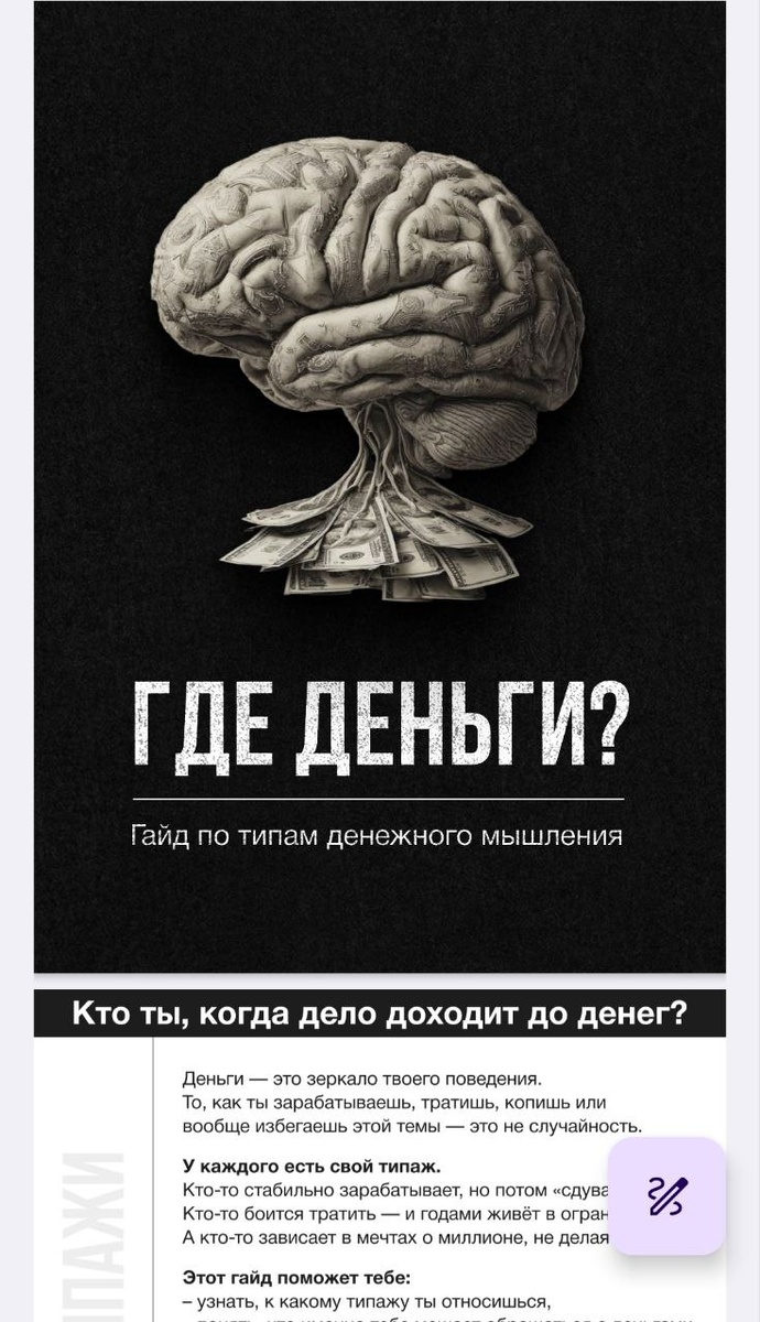 PDF гайд "Где деньги" 🤑 В нем подробно разобраны 8 стратегий обращения с деньгами. Точки потерь денег Проблемы с накоплениями и точки роста. Вы 100% найдете в нем свою стратегию. И рекомендации, что делать, чтобы денег было больше. Скачать гайд тут ⬇️ https://t.me/Neurotypology_education_bot?start=moneymoney