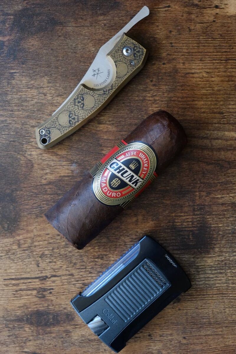AlecBradley Chunk 4XL Не смог я долго терпеть наличие такого полена в хьюмидоре. Шутка ли, 80RG. Интерес взял верх и я выкурил его практически с колес. Пишу по горячим следам, так сказать) Ну что, конечно, чудес не бывает )))) Сигара вполне обыденная, без каких-то откровений, хотя их то ожидать особо и не приходилось. Тяга ооочень легкая, практически сквозная. И это при условии, что я ее пробил самым узким пробойником, который нашел. Что бы было, если бы я решил срезать шапочку, одному богу известно. Курить ее откровенно неудобно. Держать такой ринг во рту вообще невозможно. Ну либо рот у меня не столь широкий ) Поэтому процесс курения выглядел скорее как присасывание к шапочке ) Вкусов тут тоже не сказать, что прям много. Стандартный набор для не шибко замудренного мадуро - кофе, дерево и приятные специи. Сигара на просто подымить с размерным вау-эффектом для впечатлительных друзей. При этом сказать, что сигара чем-то отталкивает (ну кроме огромного ринга) я не могу. До самого конца