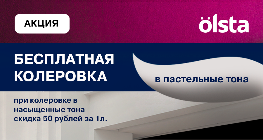 Мы запускаем новую акцию, которая сделает ваш ремонт ещё более индивидуальным и выгодным! До конца декабря 2025г. вас ждет: Успейте оформить заказ в период действия акции и получите желаемый оттенок по самой выгодной цене! Акция действует в наших фирменных салонах и при заказе на сайте: ПОЛУЧИТЬ БЕСПЛАТНУЮ КОЛЕРОВКУ