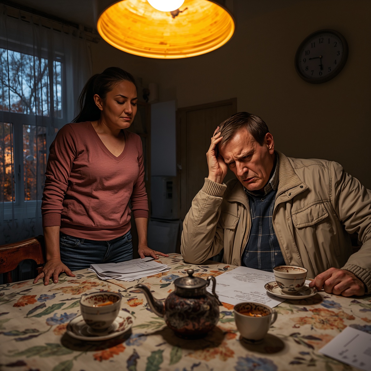 Когда Ольга вернулась на кухню, Сергей стоял у окна, глядя на темнеющее небо. Услышав её шаги, он обернулся.