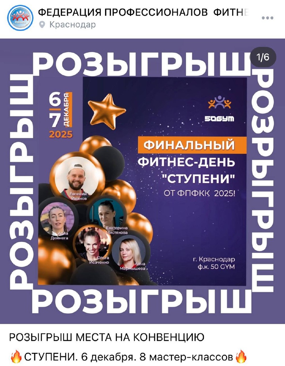 🆓РОЗЫГРЫШ УЧАСТИЯ В КОНВЕНЦИИ🆓 💙https://vk.com/wall-51478454_9061 6 декабря г. Краснодар 8 мастер-классов Переходите по ссылке и участвуйте Итоги будут подведены 20.11.2025 Вопросы: @profitness_krd Навигация по нашим каналам и материалам: РАСПИСАНИЕ 2025г. ЧАТ ФИТНЕС ТРЕНЕРА ЗАКРЫТЫЙ КЛУБ ФитнесНовости ФитнесРаботаКраснодар ФитнесРаботаКрым