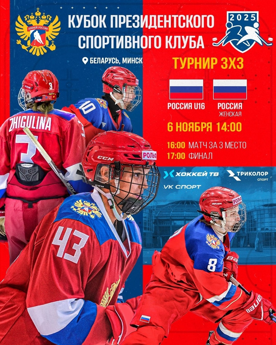 Кубок Президентского спортивного клуба. Сегодня смотрим турнир в формате 3х3 💪 В третий раз за 17 лет команды выйдут на лёд и сыграют в новом формате хоккея. Начнём с полуфиналов, затем матч за третье место и финал. Изучаем расписание, болеем за юниорскую сборную России 🇷🇺 Трансляция турнира: Хоккей ТВ, Триколор спорт, VK