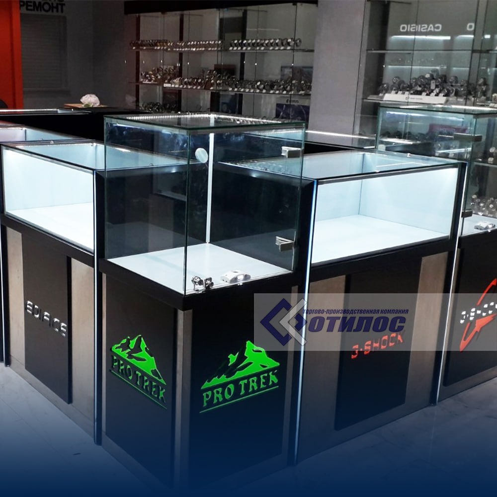 Настоящее стекло для витрин — дорого и тяжело. Прозрачный акрил (оргстекло) стоит в 3-4 раза дешевле, весит меньше, не бьется и выглядит почти так же. Единственное — берите толщину от 5 мм, тонкий акрил смотрится дешево.