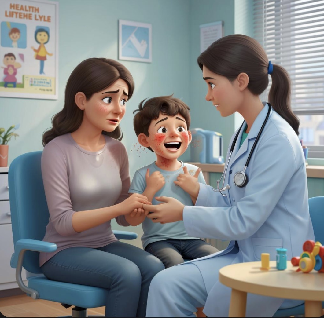 Собственно, жалобы у мамы были на сыпь на теле ребенка. Два дня назад маме показалось, что у него болело горло (сам он не жалуется, но тогда целый день отказывался от еды), была температура 37,4С однократно, но при этом он был активным, веселым и не похоже было, что чувствовал себе плохо. И все бы ничего, если бы мама не увидела на теле мелкоточечную бледно-розовую сыпь. Естественно, мама запаниковала и прибежала к врачу.
