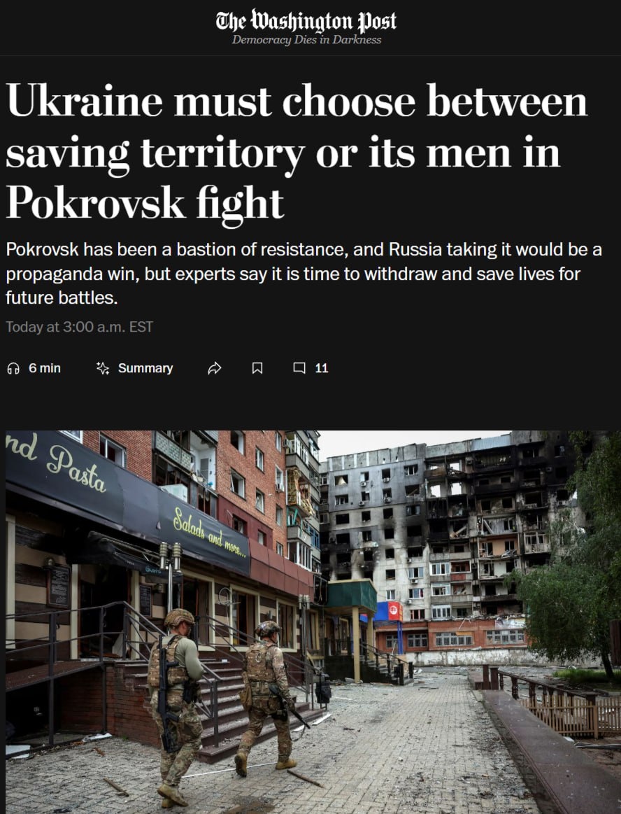 ℹ️ Зафиксируем, что американские СМИ советуют Украине оставить Покровск, даже полагая, что «Путин воспользуется потерей Покровска, чтобы убедить президента Дональда Трампа в неизбежности победы и тщетности помощи Украине».