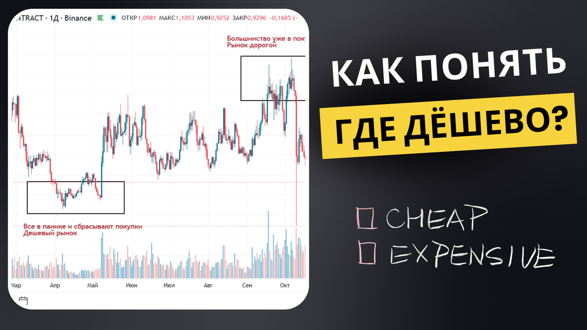 Каждый, кто решил разобраться в торговле, знает эту фразу — «Покупай дешево, продавай дорого». Но если честно, где именно это «дешево» — никто толком не объясняет. Одни говорят «лови дно», другие — «ориентируйся по тренду». В итоге новички путаются, покупают на хаях и потом месяцами смотрят, как цена падает. Попробуем разобрать где действительно дешево и как это понять без кучи индикаторов. Цена — это не просто цифра. Это отражение баланса между теми, кто хочет купить, и теми, кто хочет продать. Когда большинство уже в покупках, рынок дорогой — потому что желающих купить всё меньше. А когда все в панике и сбрасывают позиции — это и есть «дешево». Рис. 1 Но проблема в том, что рынок не показывает табличку: «всё, дальше будем расти». Поэтому вместо угадывания нужно смотреть, где именно остановилась паника и появился спрос. Один и тот же уровень может быть дешёвым сегодня и дорогим завтра. Всё зависит от того, что происходило перед ним. Представь: монета стоила 0,01 доллар, потом выро