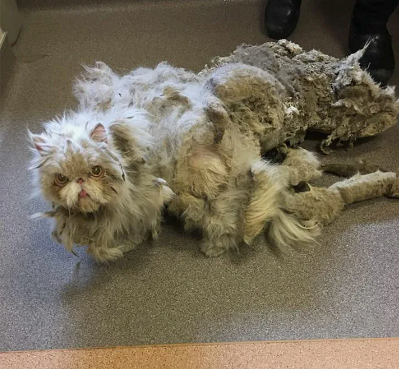 Животное было полностью скрыто под массой свалявшейся, грязной шерсти. Колтуны покрывали всё тело, свисали клочьями, волочились по полу. Казалось, кот тащит за собой целый ковёр из собственной шерсти.