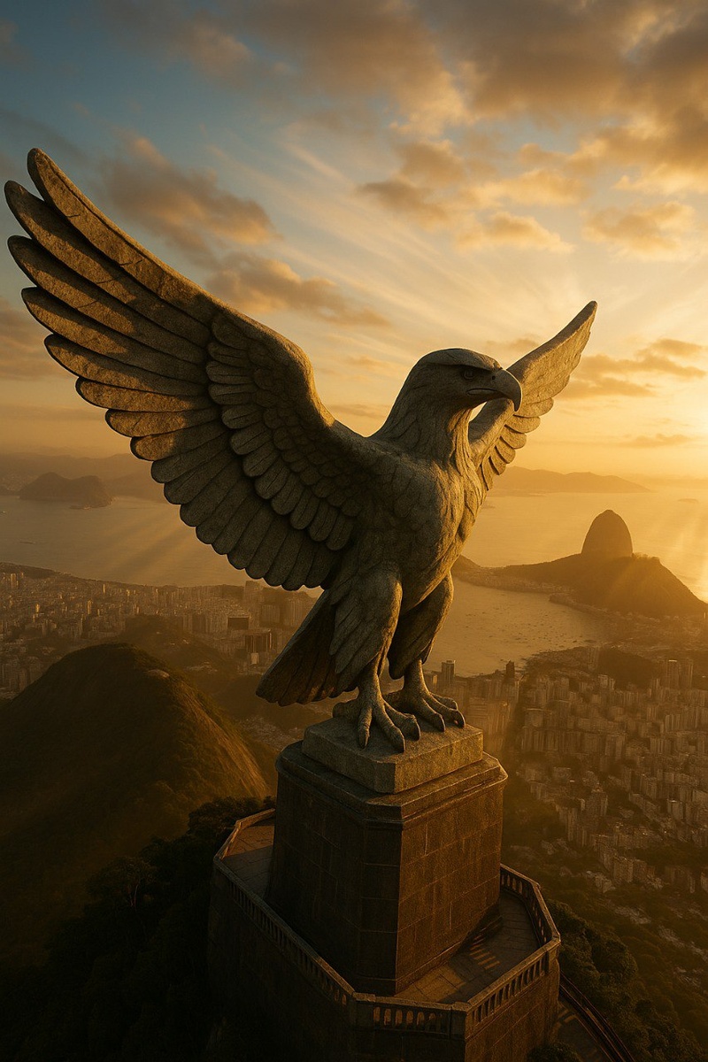 Привет, Дзен! Посмотрите на этот невероятный кадр! На фоне закатного неба, окрашенного в золотые и персиковые тона, стоит монументальная статуя орла — воплощение силы и свободы. Этот орел не просто смотрит вдаль, он словно охраняет раскинувшийся внизу город и залив, а его мощные крылья придают пейзажу поистине эпический масштаб. Кажется, мы имеем дело с очень известным, но загадочным местом! Судя по монументальности, силуэту орла и городскому пейзажу внизу, статуя напоминает одну из нескольких знаменитых скульптур орла, установленных на возвышенностях. Это не просто видео, а напоминание: чтобы увидеть красоту, иногда нужно просто подняться выше. А как вы думаете, где находится этот величественный монумент? Настоящий город или фантазия нейросети? Напишите свои версии в комментариях! 👇 Не забудьте подписаться, чтобы вдохновляться красотой вместе!