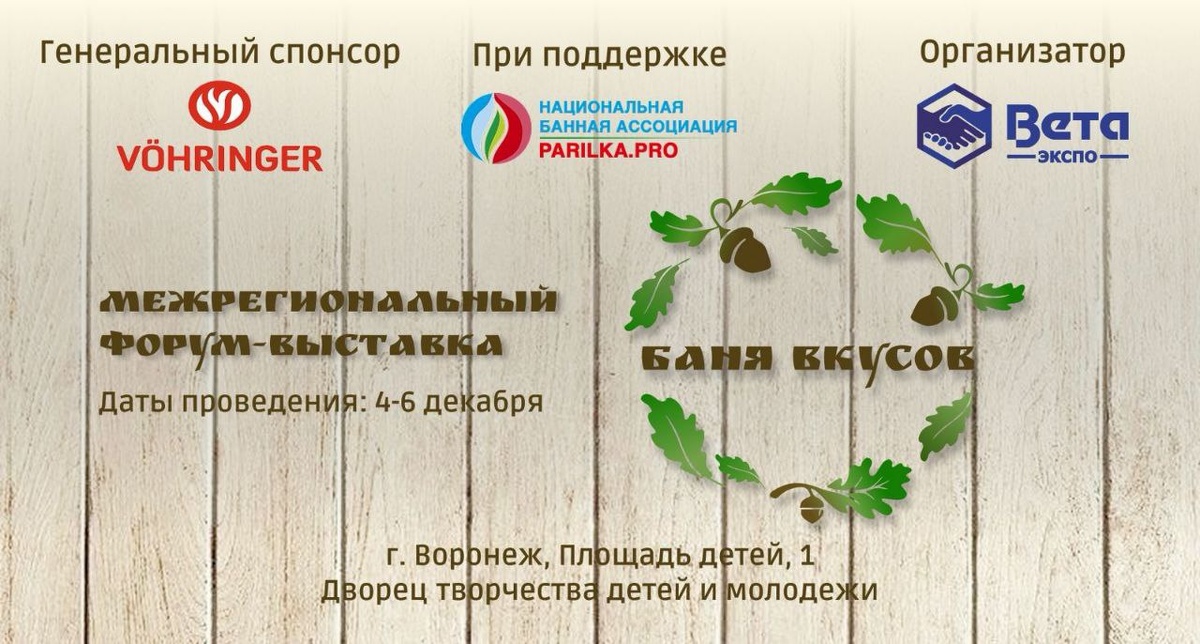 Впервые в Воронеже состоится уникальное событие — Межрегиональный Форум-Выставка «Баня Вкусов», который объединит любителей банной культуры и здорового образа жизни. Форум пройдет с 4 по 6 декабря. Организатор мероприятия — Выставочный Центр «ВЕТА», генеральный спонсор — компания «Ферингер», российский производитель банных печей. Форум состоится при поддержке Национальной Банной Ассоциации. Форум станет площадкой для нетворкинга, обмена опытом и презентации новинок рынка. Участники получат практические кейсы от лидеров индустрии и возможность найти партнеров для совместных проектов. Это отличная возможность для развития банного и спа-бизнеса. Место проведения: г. Воронеж, Площадь детей, 1, Дворец творчества детей и молодежи.