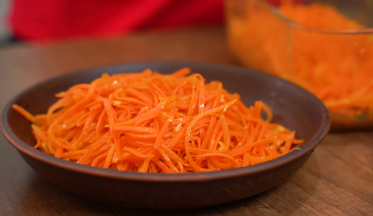 Сегодня приготовим морковь по-корейски, рецепт которой попросил один из моих читателей в комментариях под этим рецептом: Статья уже давно лежала в черновиках. Вот и случай подвернулся с вами поделиться. Получается яркий, ароматный и полезный салат, который отлично подходит и к повседневному столу, и к празднику. Готовится просто, а результат — прямо ммм… очень вкусный! А главное, вкус максимально приближен к тому самому, что мы привыкли. 🥕✨ Натереть морковь. Используйте специальную терку для корейской моркови — соломка получится длинная и тонкая. Добавить соль и сахар. Всыпьте 1 ч.л. соли и 1,5 ч.л. сахара, хорошо перемешайте. Морковь начнёт выделять сок — это хорошо. Оставьте на 10 минут. Делаем ароматное масло. Нарежьте лук и обжарьте его в 75 мл масла, чтобы масло впитало аромат. Лук нам дальше будет не нужен — можно выбросить или использовать в другом блюде. Переходим к специям. Переложите морковь в удобную миску и сформируйте небольшую горку. Сверху выложит