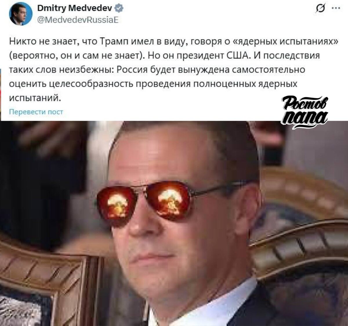 ⚡️ Россия будет вынуждена оценить целесообразность проведения полноценных ядерных испытаний, — Медведев. Последствия слов Трампа неизбежны, отметил он. 👉🏻Новости №1 в Ростове 💌Прислать новость/фото Ростов Папа теперь в Ⓜ️🅰️❌