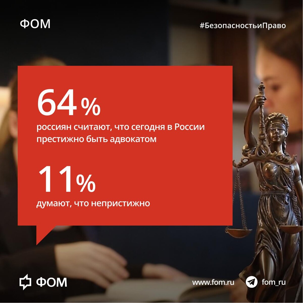 🔍 Мнение россиян о профессии адвоката Согласно результатам опроса ФОМа, 64% россиян считают, что сегодня быть адвокатом в России престижно, 11% придерживаются противоположного мнения. 76% респондентов полагают, что работа адвоката является трудной и сложной, 8% с этой точкой зрения не согласны. Если сравнить доходы адвокатов с зарплатами в других профессиях, то 35% опрошенных считают их справедливыми, 21% полагает, что адвокаты зарабатывают слишком много, 3% – что слишком мало. 23% респондентов думают, что адвокат должен браться за защиту подсудимого, только если считает обвинение несправедливым. 64% опрошенных считают, что адвокат должен защищать клиента в любых обстоятельствах, даже если считает обвинение против него справедливым. Подробнее: fom.ru #БезопасностьиПраво #адвокат #юриспруденция 📱 Фонд Общественное Мнение