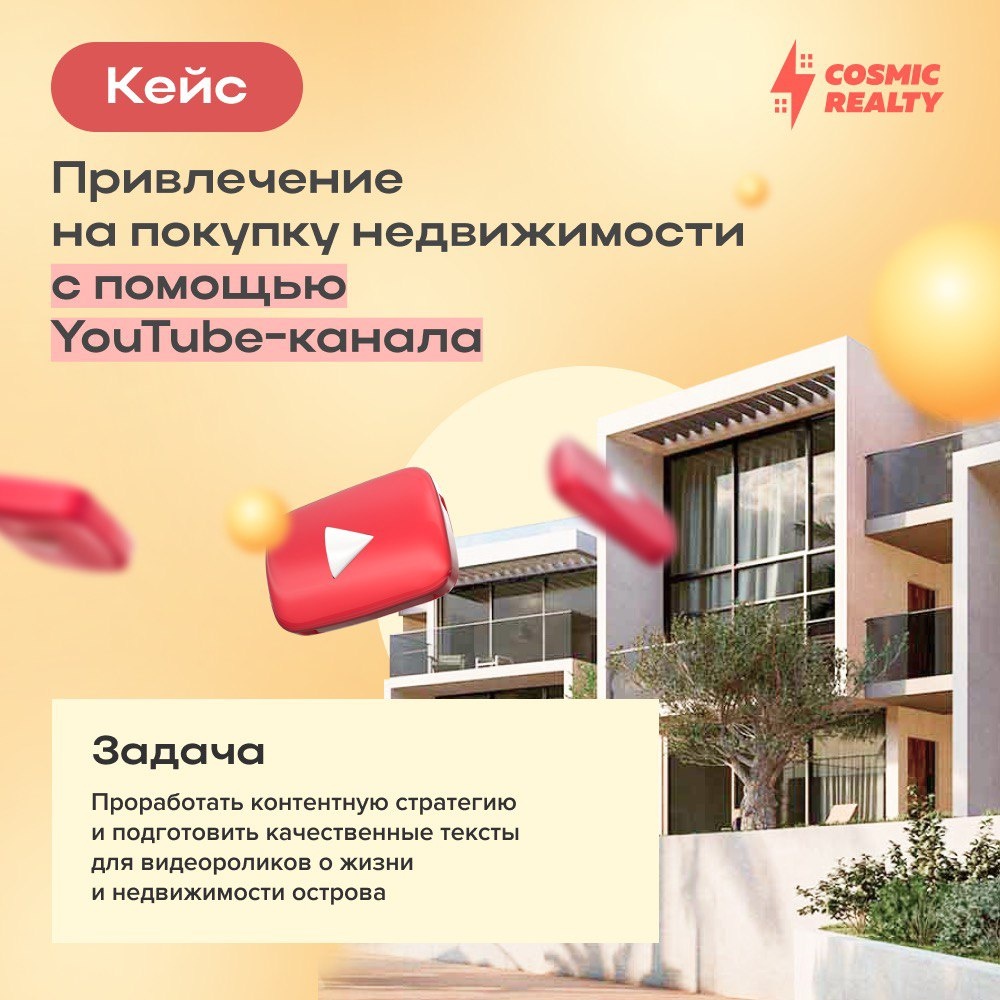 • посевы в Youtube. Оригинал статьи опубликован в блоге Cosmic Realty. Обращайтесь к нам, если у вас есть интерес к: - Получению лидов - Комплексному ведению маркетинга - Разрабо