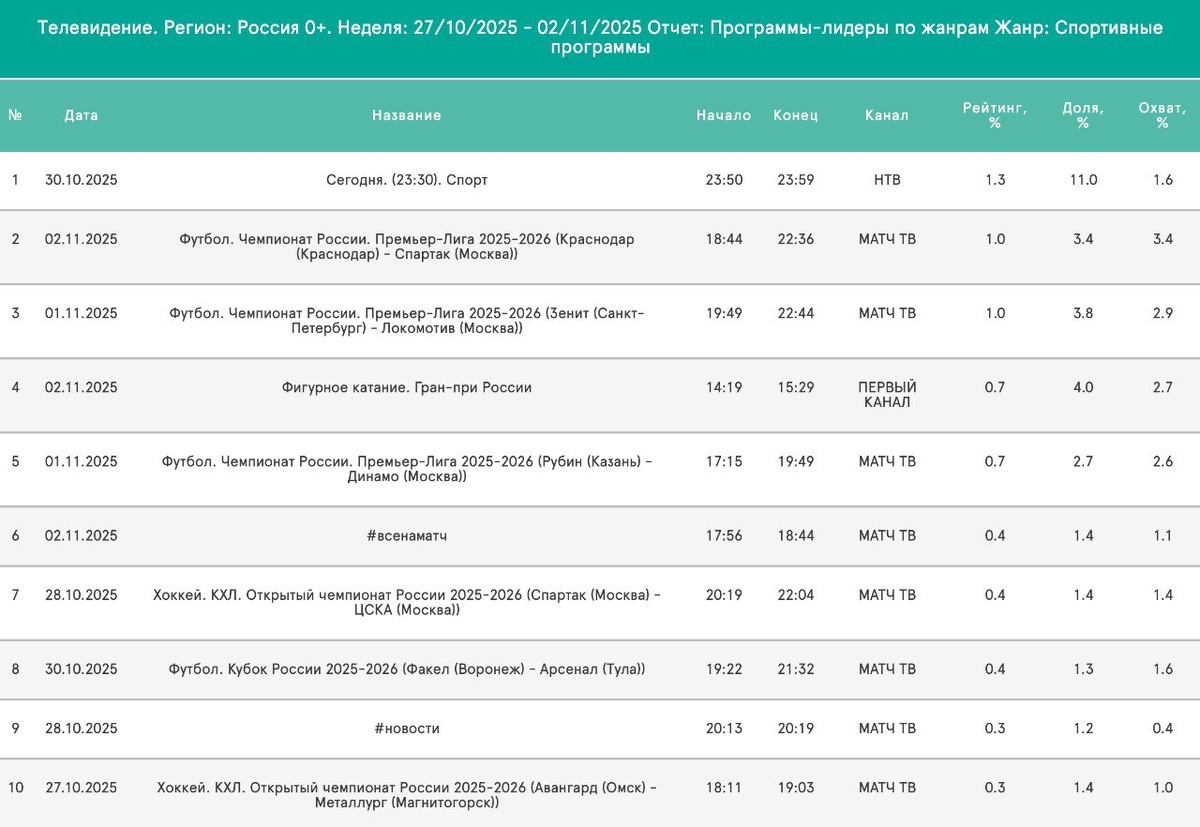 «ЧТО ПО ТЕЛИКУ»? Итоги спортивного смотрения 27.10-02.11, Россия, 4+ (137,4 млн чел.) 🗣 РПЛ продолжает регулярно стрелять в единичку рейтинга. Оба топ-матча прошлой недели набрали это ровное число. В топ-13 сезона теперь: 🟢 - 5 🔵 - 4 🔴🟠🟢🇷🇺 - 3 🗣 На этой неделе на "Матч ТВ" Кубок России (4 матча) и РПЛ (2). "Спартак" кубковый с "Локомотивом" смотрим сегодня на основном канале в 19:30, игру чемпионата в Грозном - на платнике в воскресенье в 17:30. Топ 25/26: 1.2 - 🟢:🔵| ⚫️ 1.1 - 🔴:🔵| ⚫️ 1.1 - 🇶🇦:🇷🇺 | ТМ 1.1 - ❤️:🔴| ⚫️ 1.1 - 🟢:🟠| ⚫️ 1.0 - ❤️:❤️| ⚫️ 1.0 - ❤️:🔵| ⚫️ 1.0 - ❤️:❤️| ⚫️ 1.0 - 🇷🇺:🇮🇷 | ТМ 1.0 - 🇷🇺:🇧🇴 | ТМ 1.0 - 🔵:🔵| ⚫️ 1.0 - 🟢:🔴| ⚫️ 1.0 - 🔵:🟢| ⚫️ 0.9 - 🏒 | ТМ (🌟) 0.9 - 🔵:🟡| ⚫️ 0.9 - 🏊♂ | ЧМ 0.9 - 🟢:🔵| ⚫️ 0.9 - 🔴:🔵| 🏆 0.9 - 🇷🇺: 🇯🇴 | ТМ 0.9 - 🔴:🟡| 🏆 0.9 - 🟡:🟣| 🇪🇸 Игры ❤️ на "Матч ТВ": ⚫️ 7 из 15 🏆 6 из 7 0.8 - 🔴:🔵 19.07.25 | ⚫️ 0.8 - ❤️:🔴 09.08.25 | ⚫️ 0.7 - 🔴:🔵 12.08.25 | 🏆 1.1 - 🔴:❤️ 16.08.25 | ⚫️ 0.9 - 🔴:🔵 26.