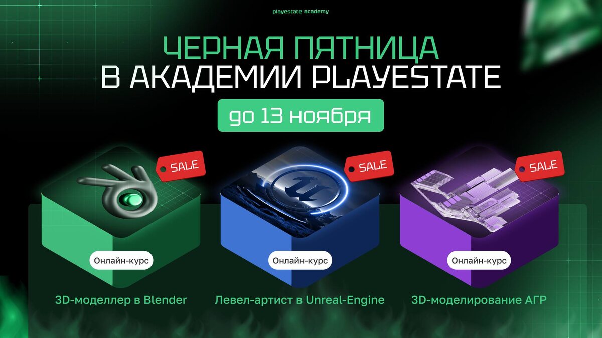 🖤 ЧЕРНАЯ ПЯТНИЦА в Академии Playestate! Если вы ждали знак – вот он. Пора сделать апгрейд своей карьеры: только до 13 ноября самые мощные 3D-направления года по ценам, которых больше не будет 👇 💚 «Профессия 3D-моделлер с нуля» (Blender) 95 000₽ → 60 000₽ → Освойте 3D с нуля, создайте до 15 работ в портфолио и выйдите на первые заказы уже через 2 месяца. 💙 «Профессия левел-артист в Unreal Engine» 75 000₽ → 50 000₽ → Научитесь собирать живые сцены, архитектурные туры и игровые локации на уровне студий AAA. 💜 «3D-моделирование для АГР» 75 000₽ → 50 000₽ → Погрузитесь в архитектурную визуализацию, моделируйте по стандартам Москомархитектуры и создавайте проекты, которые становятся частью реальных городов. 🔥 Комбо для самых решительных: любые две ступени всего 100 000₽. >>> Выбрать свое предложение: https://academy.playestate.ru Почему стоит действовать сейчас: – Вы получаете обучение по самой выгодной цене. – Начинаете карьеру в сфере, где спрос на 3D-моделлеров растет каж