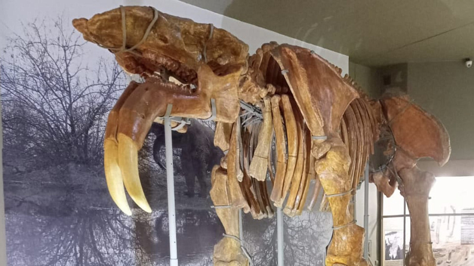 На первом этаже музея представлены экспозиции древних животных. Символом музея является скелет трогонтериевого слона (степного мамонта), жившего 800–600 тысяч лет назад, в межледниковый период. Это единственный в мире скелет с целым черепом. Он был найден в декабре 1964 года под Азовом — в Кагальницком песчаном карьере. Его высота 4,5 метров. Другой уникальный экспонат – скелет хоботного животного динотерия с бивнями, растущими из нижней челюсти. Возраст находки составляет 7,5–8 млн лет. Также представлено собрание костей ископаемых зубров.