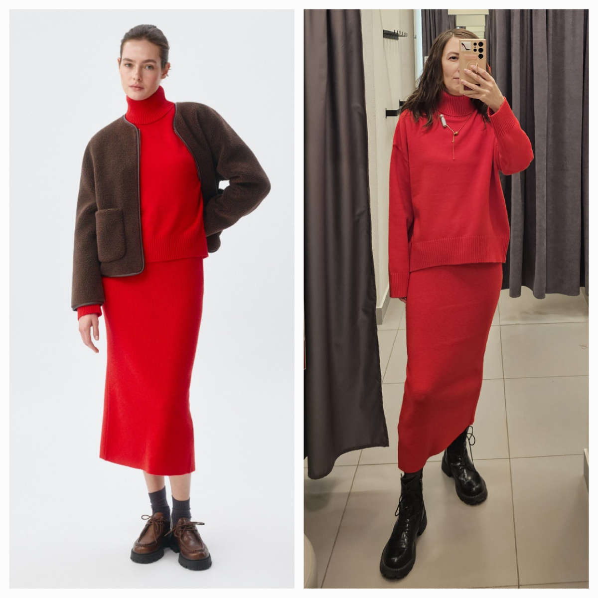 Часто на моделях вещи показываются не очень понятно: излишняя стилизация, странные позы моделей, верхняя одежда только в расстегнутом виде (но так же в холодное время года не походишь). Я и примерила вещи из новой коллекции любимой многими Sela и покажу их на себе и как они представлены на сайте бренда на моделях. Кстати, странными позами они пока не балуются, за что отдельное спасибо, но часто размер взят на один больше, чем моделям нужно по размерной сетке. Костюм: свитер , юбка Хороший базовый трикотажный костюм: уютный, но и женственный одновременно. Свитер легко впишется в образы с разными низами, с юбкой чуть сложнее - она все же лучше всего выглядит именно с "родным" верхом, но еще вариант покажу ниже. Состав - не феерия, но лучше, чем обычно, шерсти не пару процентов, а 15%, при этом материал совсем не колючий. Цвет в реальности такой. как на модели - моя камера почему - то упорно делала его более холодным, по факту - нейтральный красный - подойдет многим девушкам с контраст