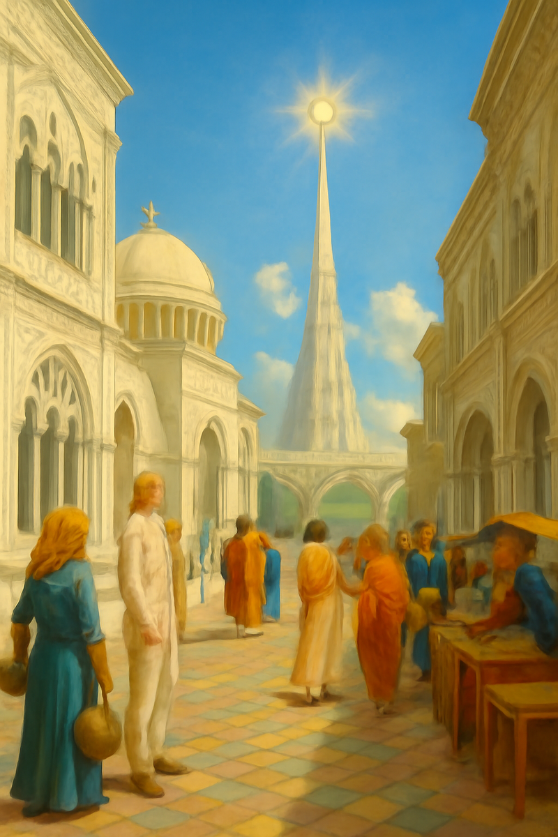 Здесь всё подчинялось гармонии и порядку. Даже закон о запрете строить здания выше трёх этажей казался Коэну мудрым: он сохранял городу свет и простор небес. Единственным исключением была резиденция правителя - Великого Светлого, в народе прозванная просто Шпиль. Это было самое высокое здание города: семиэтажный дворец с устремлённым в небо шпилем высотой более двухсот метров. На его конце сияла эмблема в виде солнца.
