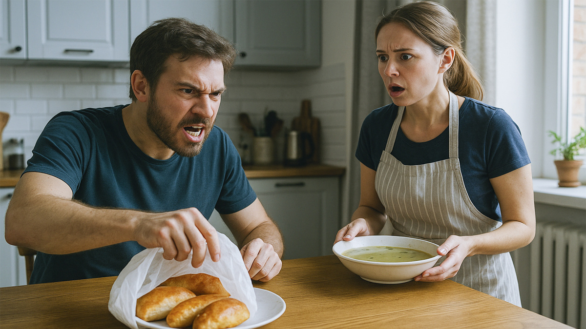 Анна села напротив. На столе — две кастрюли, два мира: её суп и его мамины пироги.