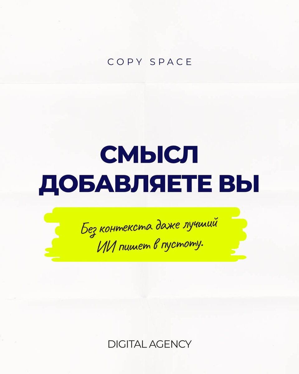 🧠 ИИ убивает текст, если не включить редактора И вот кажется, что всё получилось — текст выдан, грамматика в порядке, логика вроде есть. Но почему же ваш пост похож на тысячи других, таких ж текстов, написанных ИИ? Без редактирования такие тексты похожи на красивую обёртку без начинки. В них нет ритма, душевности, человеческой логики, должной смысловой нагрузки и вашего тон оф войс. 📍Редактор — это тот, кто осмысленно перечитывает текст после генерации и проверяет не только запятые, но логику, эмоцию и видит, где авторская мысль потерялась в шаблонах. Нейросеть не знает, кто вы и для кого пишете. Она не понимает ваш тон, стиль и аудиторию, пока вы сами не зададите контекст. Если просто написать «сделай продающий текст», вы получите усреднённый результат. Чтобы ИИ писал внятно, ему нужен точный промт: что за бренд, кто читатель, какая цель текста и интонация. И даже после самого продуманного промта всё равно нужна редактура. ИИ пишет шаблонно, часто повторяет одни и те же обороты