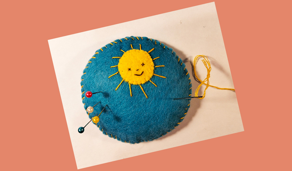 На желтом кружочке можно вышить глазки, нос и ротик (фото 12). Накладываем наше солнышко на верхнюю часть игольницы (так же можно использовать скотч), при этом в любое место – посередине или ближе к краю, вы сами выбираете расположение. И желтыми нитками (в цвет солнышка) пришиваем его к голубому, просто через край. При этом первый узелок нитки должен быть на изнанке, а закончив пришивать, закрепляем нитку так же на изнанке (фото 13).