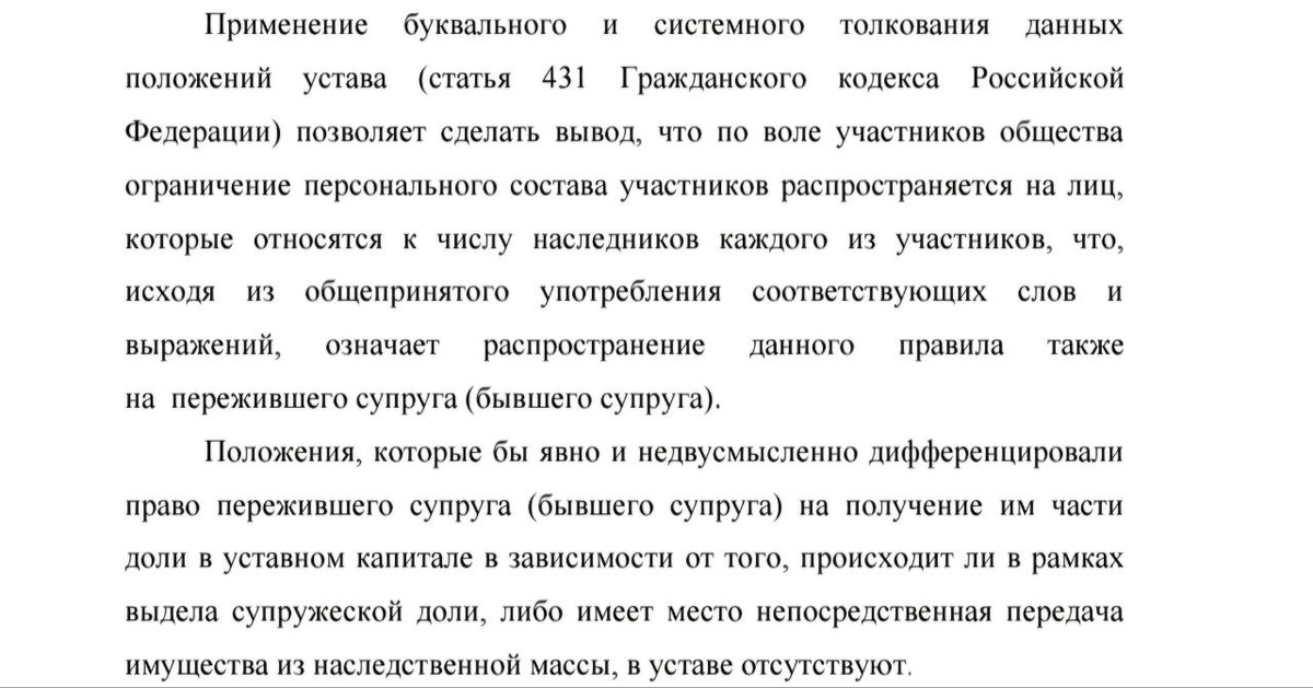 Первая: 📝Когда суд прав по сути (по смыслу и справедливости), но, на мой взгляд, его мотивировка, правовая позиция не соответствует текущему закону. 🖱️Суть спора: Доля в ООО приобретена в браке, потом супруги развелись, имущество не поделили. Супруг умер. В уставе общества ограничение: наследники принимаются только с согласия остальных участников. Бывшая супруга - не наследник, но она пошла и выделила себе долю (разделила общее имущество) и вошла в ООО беспрепятственно, тк ограничение касалось наследников. Участники пошли оспаривать. Говорят, должна была получить наше согласие, если его нет, то у бывшей супруги только право на денежную компенсацию за доли. 📎Суды 1й инстанции и апелляции встали на сторону бывшей супруги. Она вошла не как наследник, а как бывший супруг. 📎Суд кассационной инстанции посчитал, что из системного и буквального толкования такой барьер на вход распространяется и на пережившего бывшего супруга 🤷♀ 📎Как можно так буквально истолковать мне не понятно, но по