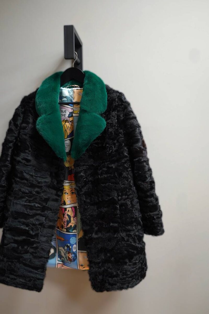 Из классической шубы из лапок каракуля мы создали современное пальто — с изумрудным воротником из норки и подкладом в стиле pop-art